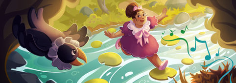 A key-frame from a self-developed childrens book, The Melody of Thespis. The main character, Isabella is hopping across the river.